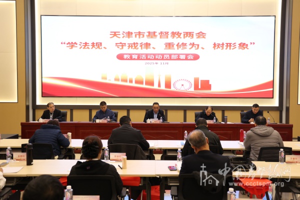 为深入学习贯彻习近平总书记关于宗教工作的重要论述,坚持我国宗教中国化方向,推动全面从严治教走深走实,2025年11月17日,天津市基督教两会在市民族文化宫召开“学法规、守戒律、重修为、树形象”教育活动动员部署会,正式启动全市基督教界主题教育活动。此次活动在庄严的国歌声中开幕,市基督教两会班子成员、监事会监事、全体教牧人员及各堂点负责人、核心同工百余人参加,市民族宗教委及市基督教工作秘书处相关负责同志列席会议并讲话。